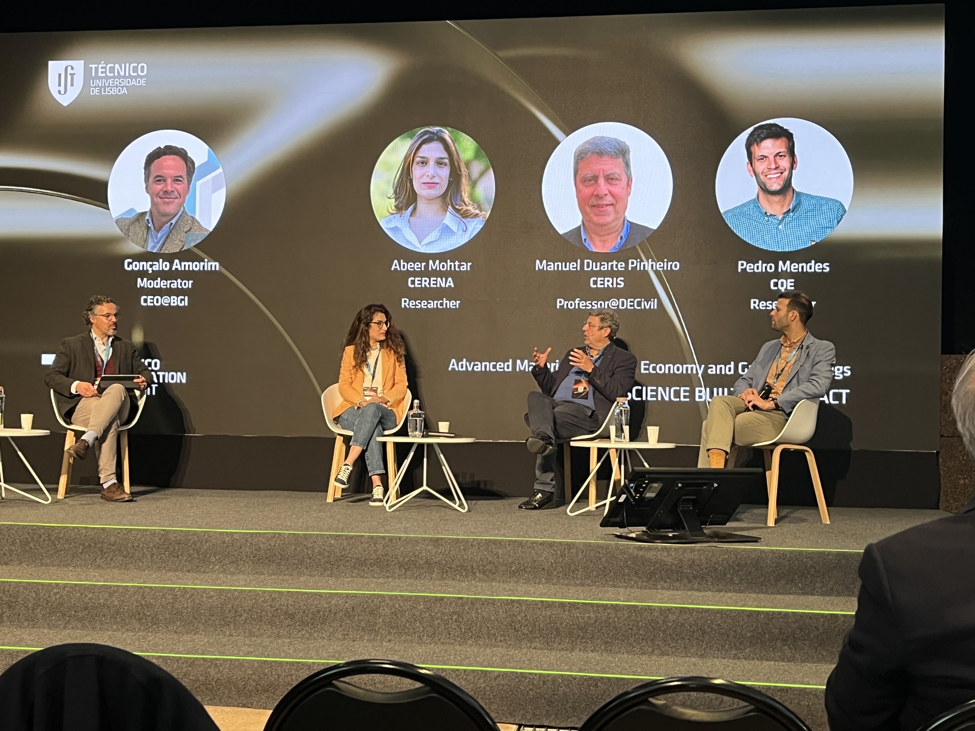 Later in the morning, Maria João Pereira took part in the fourth roundtable, alongside Fátima Montemor (CQE) and Paulo Ferrão (IN+), to debate Sustainable Energy, Smart Cities, and Mobility. It was highlighted the necessity to search for more sustainable materials, to circumvent our current environmental footprint.